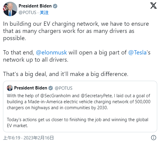 电动车充电站对于电动车的普及非常重要,因为它们可以让电动车在路上行驶时能够方便地充电。 美国总统拜登想要帮助美国的电动车和电池制造业发展,所以他通过了一些法律和政策。比如,他推出了一个叫做《通胀削减法案》的气候法案,这个法案提供了税收优惠,鼓励公司在美国生产电动车和电池。此外,拜登还签署了一项法案《两党基础设施法》,并计划投入75亿美元来建设这些充电站。 2023年2月,拜登总统在推特上写道:“在建设电动车充电网络的过程中,我们必须确保尽可能多的充电器,这样不管是哪种品牌的电动车,司机们都能找到充电站为车辆充电。为此,马斯克同意开放大部分特斯拉的充电站网络。这是一件大事,它将产生巨大的影响。”